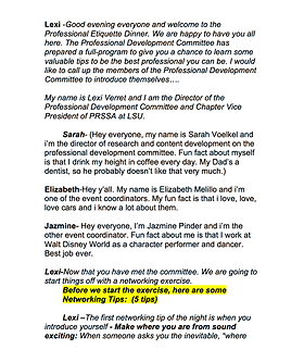 I served as the director of the professional development commitee at PRSSA at LSU. One of the events that the commitee put on was the Professional Etiquette Dinner. As director, I planned the logistics, wrote the program and managed four other directors. The dinner provided members with dinner etiquette for client meetings, email etiquette, a fashion show that showcased business professional, business casual and casual. The dinner also had networking tips and opportunities. Below are images from the event, as well as the program. To view each work more closely, please click the image.