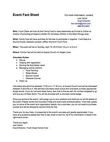 I served as the event director for Youth Oasis Family Fest. This was the kick off event for a year-long campaign for the organization. It's purpose was to raise funds and awareness to further the mission of Youth Oasis, a homeless shelter for children. It was at Acacia Church on April 19, 2015, from 12 p.m. -3 p.m. It featured family activities such as obstacle courses, relay races, live music, prizes, a cake walk, face painting bounce house and a fire breather. Below are samples of the event plan memo, a final budget, a volunteer packet, an event logistics schedule, and photos from the event. To take a closer look, please click on the image.